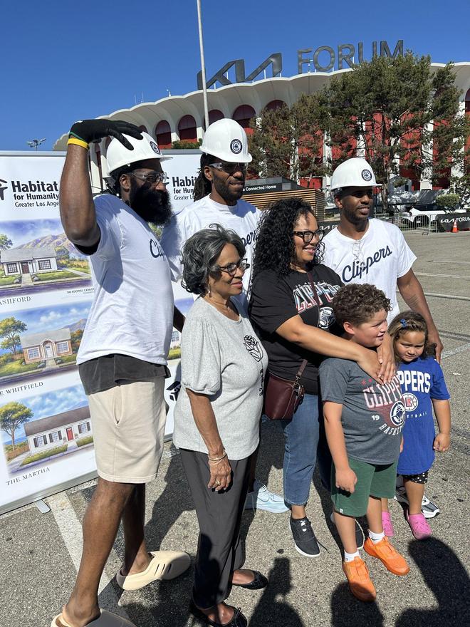 40岁的保罗不仅拿着锤子钉钉子,而且使用电钻工作,工作起来十分认真;快船众星与球迷一家合影,哈登妖娆的姿势十分抢镜。